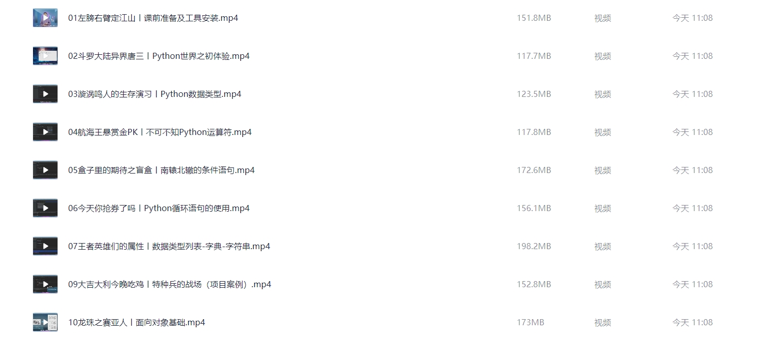 Python零基础30天速通(小白定制版)[ 付费59.9买的教程 ] 栏目:学习区 作者:喵喵 时间:2025-01-23 11:22:51      **简介:** 在B站上花了59.9买来的,自己大概花了8天时间学了一遍,在这里免费分享给大家。这套课比较诙谐幽默易懂,个人觉得非常适合小白学习,如果之前有学过一些编程语言的话,基本一周左右就可以学会,没有底子的小白,最慢30天也能学会! > [!success] **资源链接** > [https://pan.quark.cn/s/82967a82c49e](https://pan.quark.cn/s/82967a82c49e "https://pan.quark.cn/s/82967a82c49e") 版权声明:本站不存储任何实质资源,该帖为发布的网盘链接介绍帖。如您认为本站任何介绍帖侵犯了您的合法版权,请联系站长 ( 微信:wxid_ndplw29exf6921 ) 进行投诉,我们将在确认本文链接指向的资源存在侵权后,立即删除相关介绍帖子!