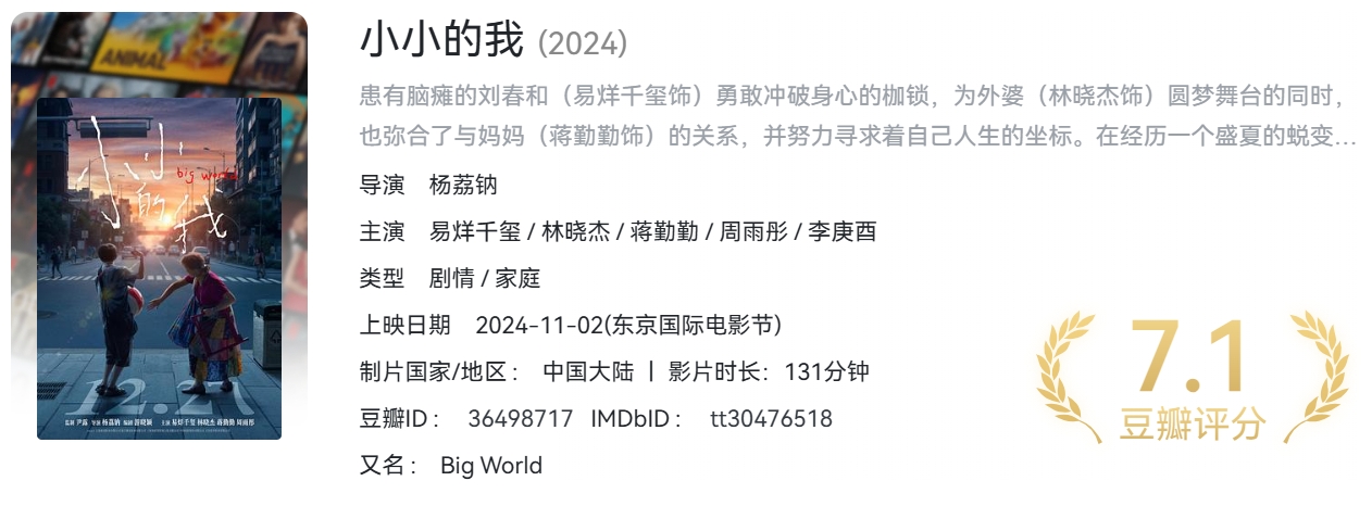 小小的我(2024)正式版 易烊千玺【4K HQ 高码率 60帧率版】【DTS5.1环绕声】国语中字【24.2G】 栏目:电影区 作者:喵喵 时间:2025-02-05 09:58:04   **剧情简介:** 患有脑瘫的刘春和(易烊千玺饰)勇敢冲破身心的枷锁,为外婆(林晓杰饰)圆梦舞台的同时,也弥合了与妈妈(蒋勤勤饰)的关系,并努力寻求着自己人生的坐标。在经历一个盛夏的蜕变后,他终于踏上了新的旅程。 > [!success] **资源链接** > [https://pan.quark.cn/s/1adb6e40d0a9](https://pan.quark.cn/s/1adb6e40d0a9 "https://pan.quark.cn/s/1adb6e40d0a9") 版权声明:本站不存储任何实质资源,该帖为发布的网盘链接介绍帖。如您认为本站任何介绍帖侵犯了您的合法版权,请联系站长 ( 微信:wxid_ndplw29exf6921 ) 进行投诉,我们将在确认本文链接指向的资源存在侵权后,立即删除相关介绍帖子!