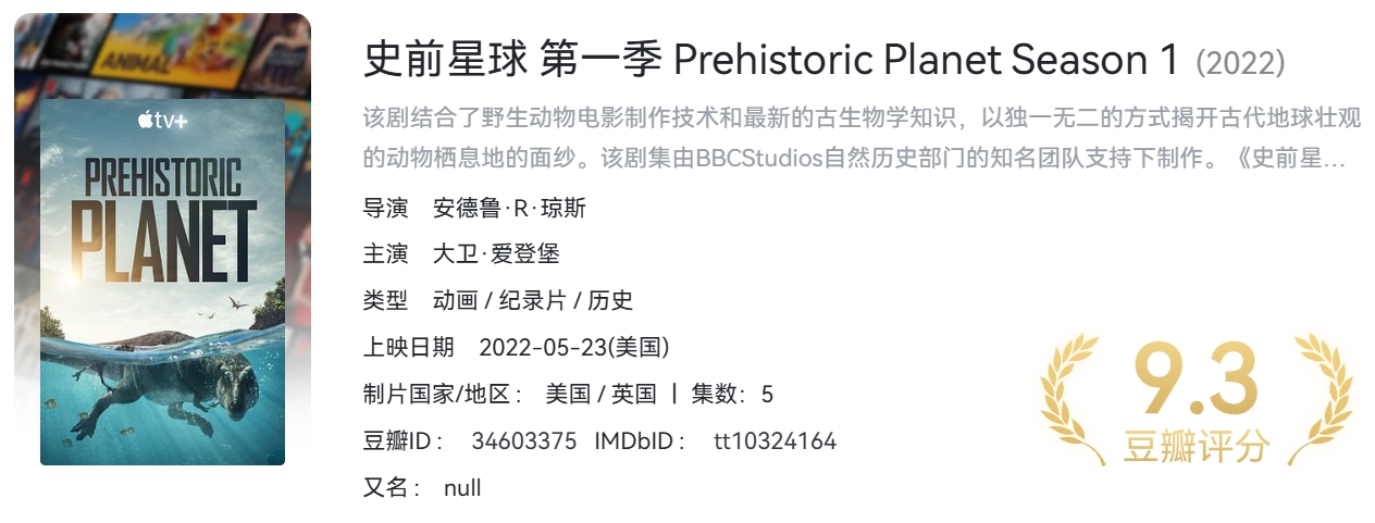 BBC纪录片《史前星球》S01-S02季合集 【4K HDR 高码率】 内封简繁英双语特效字幕【98.6G】 栏目:纪录片 作者:喵喵 时间:2025-02-14 13:32:39     **简介:** 该剧结合了野生动物电影制作技术和最新的古生物学知识,以独一无二的方式揭开古代地球壮观的动物栖息地的面纱。该剧集由BBCStudios自然历史部门的知名团队支持下制作。《史前星球》以白垩纪时代的环境为背景,描绘了海岸、沙漠、河流、冰雪世界和森林的场景,展示了鲜为人知且令人惊讶的恐龙生活。 > [!success] **资源链接** > [https://pan.quark.cn/s/dda9cf7c0d6d](https://pan.quark.cn/s/dda9cf7c0d6d "https://pan.quark.cn/s/dda9cf7c0d6d") 版权声明:本站不存储任何实质资源,该帖为发布的网盘链接介绍帖。如您认为本站任何介绍帖侵犯了您的合法版权,请联系站长 ( 微信:wxid_ndplw29exf6921 ) 进行投诉,我们将在确认本文链接指向的资源存在侵权后,立即删除相关介绍帖子!