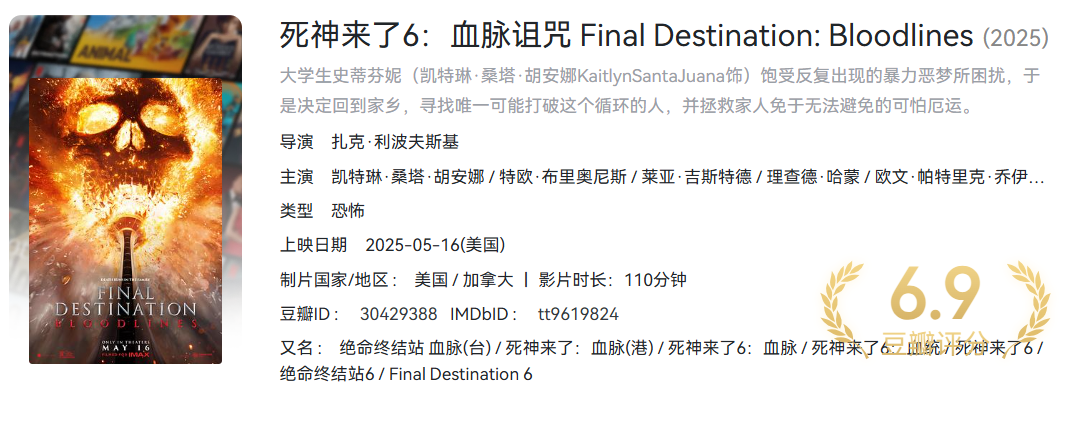 死神来了6:血脉诅咒(2025)【MA / 4K / SDR / 高码率】【杜比全景声】【简繁双语特效字幕】【19.4G】 栏目:电影区 作者:喵喵 时间:2025-06-20 06:50:29    **简介:** 死神来了系列最新电影,第六部上线,资源画质极佳! > [!success] **资源链接** > [https://pan.quark.cn/s/23ab6dcb6aee](https://pan.quark.cn/s/23ab6dcb6aee "https://pan.quark.cn/s/23ab6dcb6aee") 版权声明:本站不存储任何实质资源,该帖为发布的网盘链接介绍帖。如您认为本站任何介绍帖侵犯了您的合法版权,请联系站长 ( 微信:wxid_ndplw29exf6921 ) 进行投诉,我们将在确认本文链接指向的资源存在侵权后,立即删除相关介绍帖子!