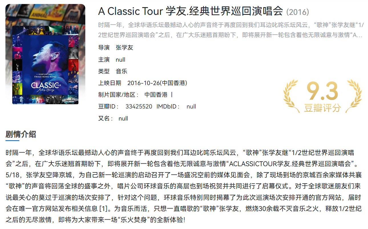 张学友演唱会 2007-2019 Bluray REMUX 1080i AVC 共6场演唱会【249.6GB】 栏目:杂烩区 作者:喵喵 时间:2025-06-29 14:09:02   **简介:** 张学友演唱会6场高清实录,稀缺资源,就快绝版了,想要的赶紧转存,不然后面哪天就找不到了! > [!success] **资源链接** > [https://pan.quark.cn/s/461432c93c7c](https://pan.quark.cn/s/461432c93c7c "https://pan.quark.cn/s/461432c93c7c") 版权声明:本站不存储任何实质资源,该帖为发布的网盘链接介绍帖。如您认为本站任何介绍帖侵犯了您的合法版权,请联系站长 ( 微信:wxid_ndplw29exf6921 ) 进行投诉,我们将在确认本文链接指向的资源存在侵权后,立即删除相关介绍帖子!