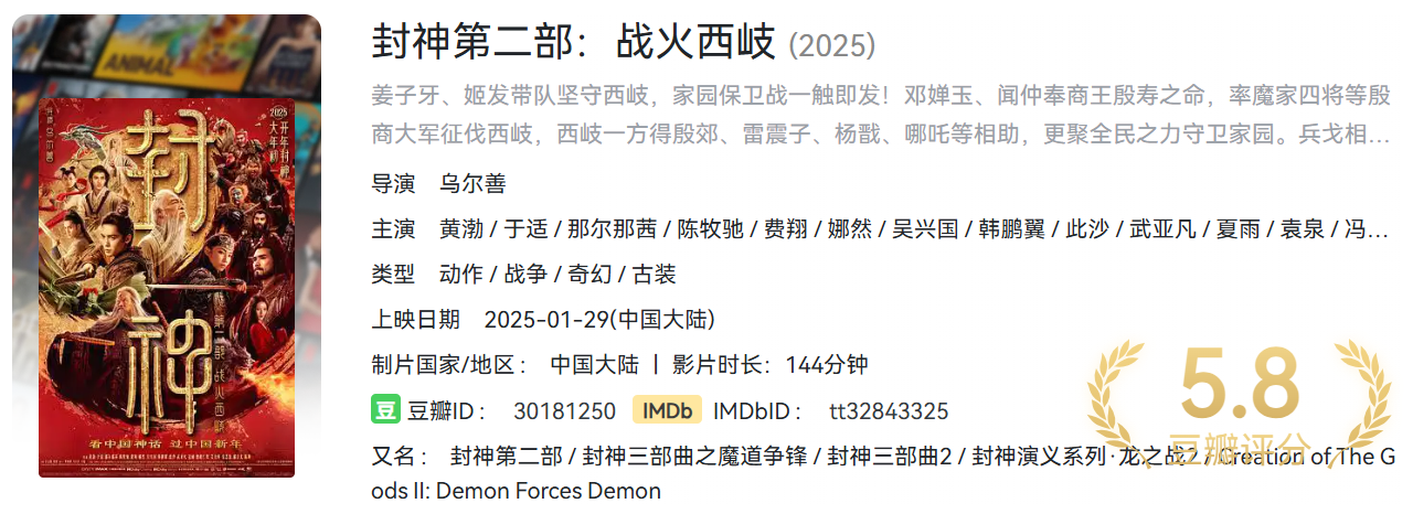 封神第二部:战火西岐 ( 2025年上映 )【2K超清画质 + 影院杜比音效】黄渤主演 栏目:电影区 作者:喵喵 时间:2025-08-07 08:54:06    **简介:** 这是2023年封神第一部的续作,非常好看,目前已出超清画质视频资源,纯2K,具有跟影院一样的杜比音效。 > [!success] **资源链接** > [https://pan.quark.cn/s/a32acefc2282](https://pan.quark.cn/s/a32acefc2282 "https://pan.quark.cn/s/a32acefc2282") 版权声明:本站不存储任何实质资源,该帖为发布的网盘链接介绍帖。如您认为本站任何介绍帖侵犯了您的合法版权,请联系站长 ( 微信:wxid_ndplw29exf6921 ) 进行投诉,我们将在确认本文链接指向的资源存在侵权后,立即删除相关介绍帖子!
