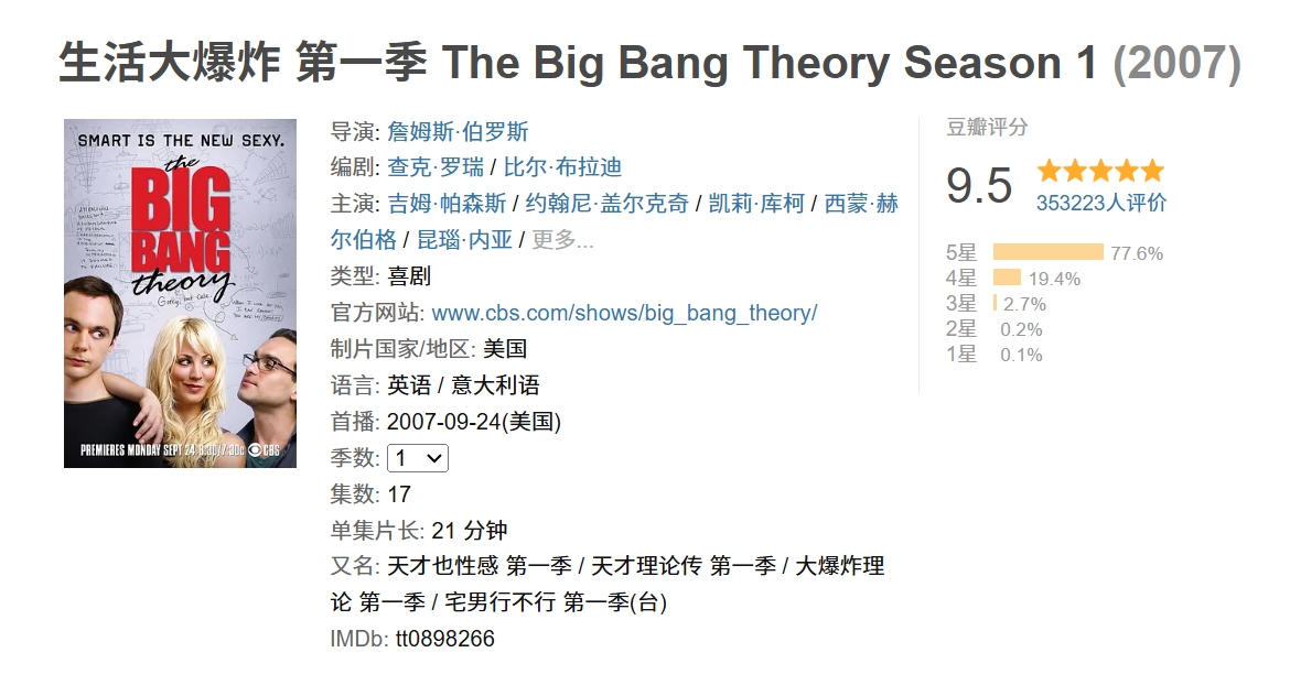 经典高分喜剧《生活大爆炸》1-12季 1080P蓝光 内嵌中英字幕 高清无水印收藏版 栏目:剧集区 作者:喵喵 时间:2025-01-10 16:14:25    **导演:**詹姆斯·伯罗斯 **编剧:**查克·罗瑞 / 比尔·布拉迪 **主演:**吉姆·帕森斯 / 约翰尼·盖尔克奇 / 更多... **类型:**喜剧 **制片国家/地区:**美国 **语言:**英语 / 意大利语 **首播:**2007-09-24(美国) **集数:**17 **单集片长:**21 分钟 **剧情简介:**Leonard 和 Sheldon是一对合起来智商超过360的疯狂科学家宅男。他们的科学家朋友还有风流的 Wolowitz 和从来不和女人说话的印度人。最近,科学家宅男的对门搬来一个超好看的女剧作家兼餐厅招待 Penny。宅男开始蠢蠢欲动了,于是诸多啼笑皆非的故事在几个朋友间“爆炸”开来。 > [!success] **资源链接** > [https://pan.quark.cn/s/87eb2410f299](https://pan.quark.cn/s/87eb2410f299 "https://pan.quark.cn/s/87eb2410f299") 版权声明:本站不存储任何实质资源,该帖为发布的网盘链接介绍帖。如您认为本站任何介绍帖侵犯了您的合法版权,请联系站长 ( 微信:wxid_ndplw29exf6921 ) 进行投诉,我们将在确认本文链接指向的资源存在侵权后,立即删除相关介绍帖子!